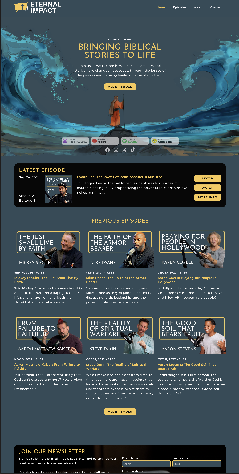 The Eternal Impact website at eternalimpact.fm was designed and developed in Webflow, built to house the episode library, host video and audio embeds, and surface content through a CMS synced from the Airtable production base.